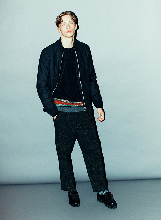 フランスの詩人シャルル・ボードレールが見出した遊歩者の意を持つ語“フラヌール”から着想を得たブランド〈メゾン フラネール〉。ネップ素材が印象的なセットアップと、メルトン素材のボンバージャケットとの質感豊かな組み合わせは、“現代の遊歩者”に相応しいスタイリングです。