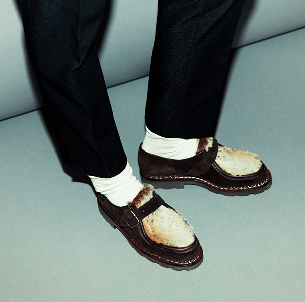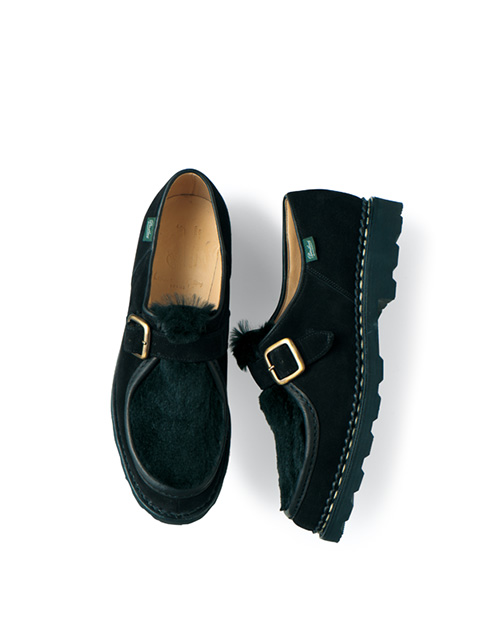 〈パラブーツ〉の人気モデル『ミカエル』のモンクストラップスタイル『ミカエル ブリッド』が復刻。別注でヴァンプ部に配したラビットファーとスエードのコンビは、秋冬の着こなしのアクセントになりそう。ブラックとブラウンの2色展開。製法は堅牢なノルヴェイジャン・ウェルテッド。