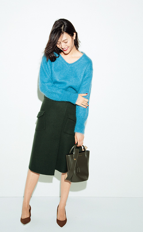 秋冬らしい重厚感とクリーンさ、両方を感じさせる配色。シャギー感のある大きく開いたVネックのニットは、少し首を“抜いて”女っぽく着こなしたい。
