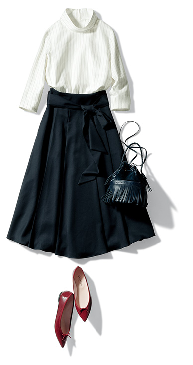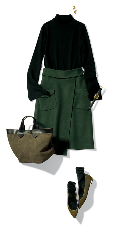 ハイネックニット×台形スカートの組み合わせが、どこかレトロなイメージ。ソックスを合わせた甘めのコーディネートも、配色がビターだから大人に似合うさじ加減に。