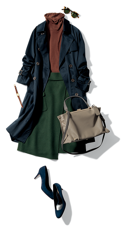落ち着いたカーキだから、合わせるアイテムを幅広く選べます。合わせたニットもコートもベーシックだけれど、秋色を吟味して重ねることで、ぐっと鮮度の高い着こなしに。
