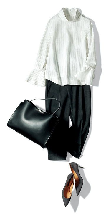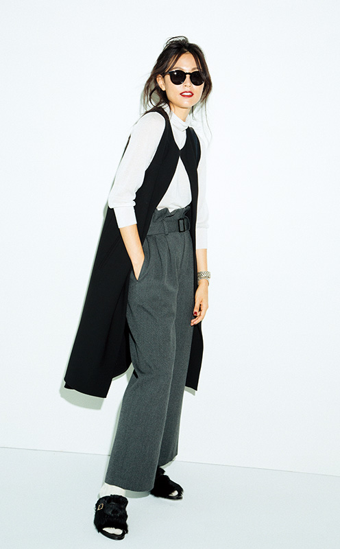 モノトーンでまとめ、ワイドパンツをスタイリッシュに。小物も少し“味”の強いものをピックアップ。たとえばこの秋なら、やや厚手のソックス&ファーサンダルを。