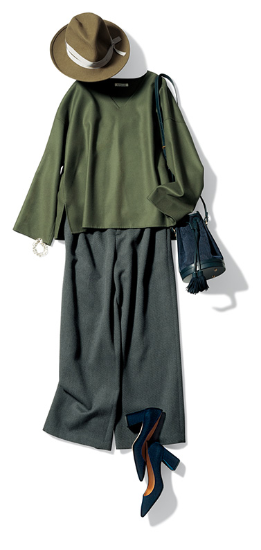 上下ゆるっとまろやかなシルエットなので、中折れ帽とチャンキーヒールパンプスを引き締め役に。モダンなコンクリートグレーは、テイストもシーンも選ばず活躍してくれる。