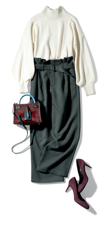 パンツとニット、どちらもボリュームのあるコンビ。ハイウエストならもたつかず、今どきのバランスが完成。ベルトを結ぶことで生まれるギャザー感で、パンツも優雅に。
